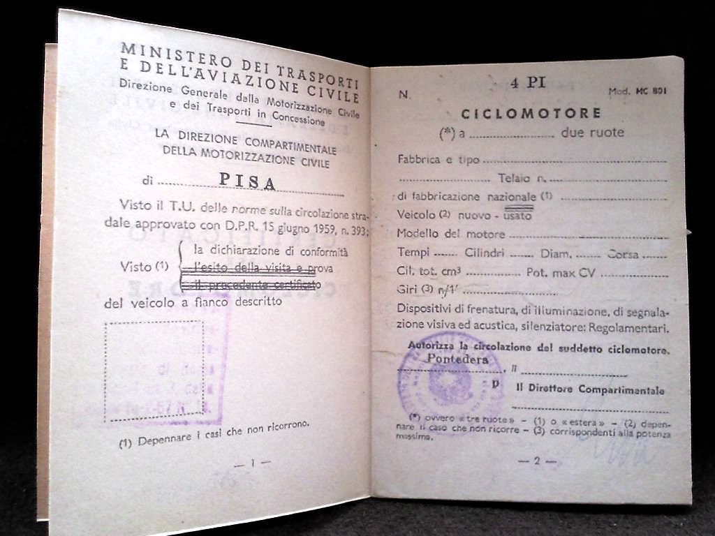 libretto di circolazione vespa 50 special